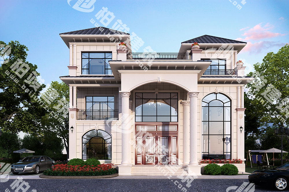 欧式构件:经典罗马柱、欧式雕花、花盆、花瓶型护栏、简约窗套相搭配,营造典雅欧风